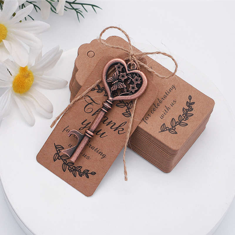 This 18g (7.1cm) opener mimics a vintage key, with a heart-shaped top etched with butterflies/flowers, available in copper/silver/rose gold. It pops caps easily, making it a romantic favor for weddings, bridal showers, packaged with a "Thank You" tag.