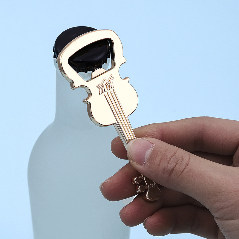 This 29g (9cm) gold opener mimics a detailed violin design. It easily removes bottle caps, merging musical charm with practicality—ideal for gifting music lovers, using as a party favor, or adding an artistic touch to barware.