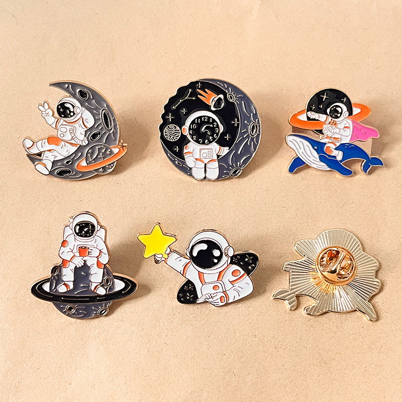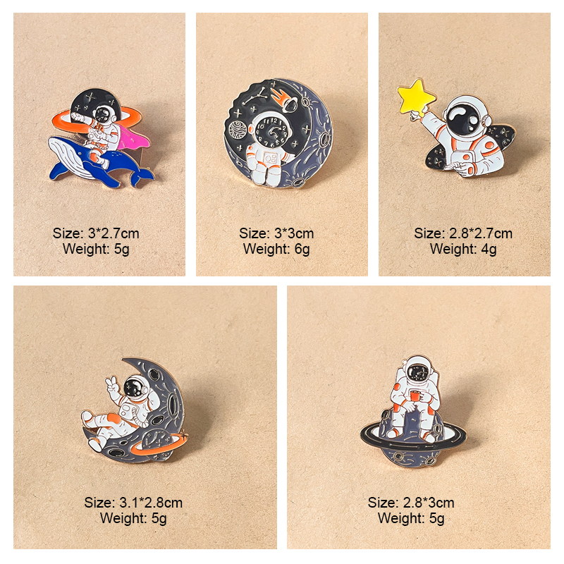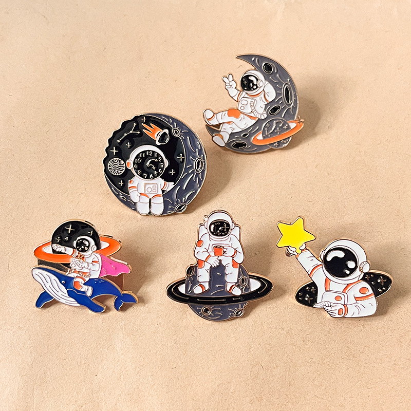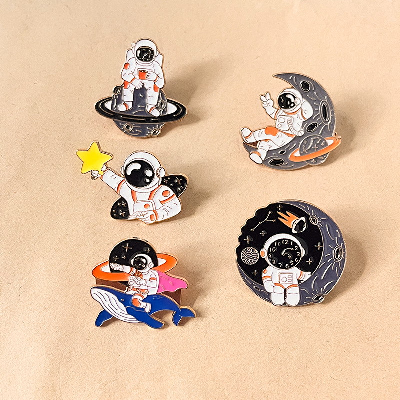 5 playful pins feature astronauts (holding a star, riding a whale, on a planet, lounging on the moon, with a moon clock)—blending cosmic charm and quirky creativity. Perfect for adding space flair to bags/jackets or collecting as lively aerospace keepsakes.