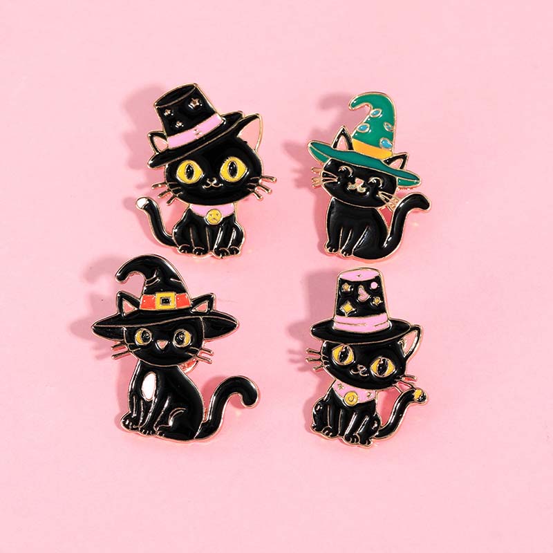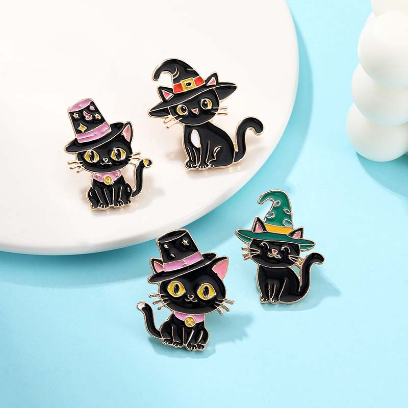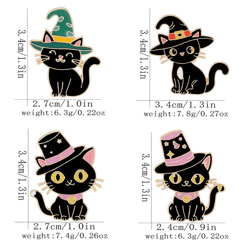 Features 4 whimsical black cats in colorful witch hats—charming, spooky-cute vibes. Perfect for cat/fantasy fans to add magical flair to bags/jackets, ideal for daily styling or Halloween-themed accessory decor.